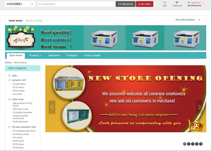 合创达线材测试仪 速卖通专营店 开张啦!主要展示的产品有:连接器、四线精密线材测试仪、高精密线材/连接器综合测试仪、短路冲断修复仪、直流低电阻测试仪、高压测试仪、电源插头线综合测试仪、程控耐压/绝缘电阻测试仪、可程式恒温恒湿试验机、插拔力、摇摆、拉力、盐雾试验机。