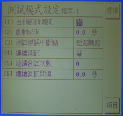 第四项 《连续测试》:(开或关)。设定为“开”时第五项、第六项才起作用;设定为“关”时第五项、第六