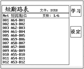 本机台对于断短路设定是以学习的方式作设定的,亦即将测试线材之连接情形记忆在系统中,而系统将测试之结果显示于LCD上